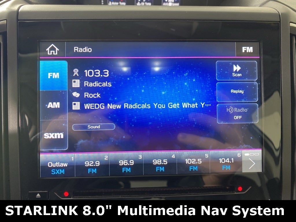 - Radio: Subaru STARLINK 8.0" Multimedia Plus System -inc: AM/FM stereo, HD Radio, single disc CD player w/MP3/WMA/CRR/RW file capability, multi-touch gesture high resolution display screen, voice activated controls, Bluetooth® audio streaming and hands-free phone connectivity, Bluetooth® hands-free SMS text messaging connectivity, Near Field Communication (NFC), iPod control capability, SiriusXM All Access Radio (4 months free trial/subscription required after), SiriusXM Travel Link (4 months free trial/subscription required after), smartphone integration: AHA, Android Auto, CarPlay, Pandora and STARLINK cloud applications, USB and Over The Air (OTA) audio system update, steering wheel audio and Bluetooth® control switches, 6 speakers (2 dash panel tweeter, 2 front door and 2 rear door), 3.5mm auxiliary input jack and front dual USB A input/charge ports